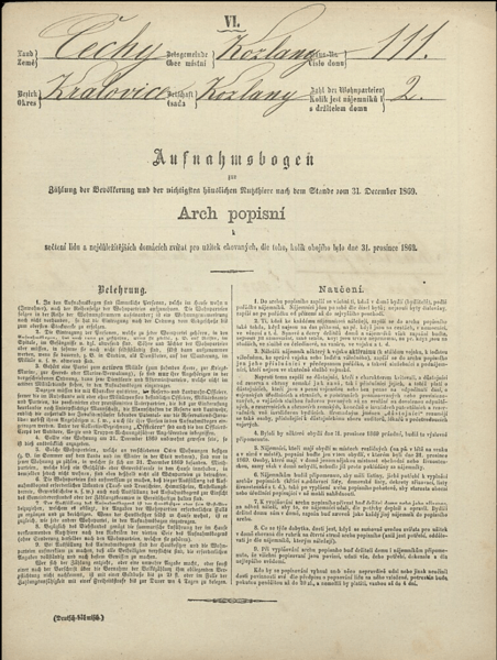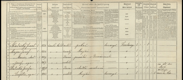 In Portafontium sind auch Volkszählungen abfragbar (Details zur Suche im Kapitel weiter unten). Der frühest- verfügbare Census ist aus dem Jahr 1869. Zu dem Zeitpunkt war die Familie Rott bereits nach Podersam übersiedelt, aber im Haus Nummer 111 finden sich beispielsweise Verwandte. Praktischer Weise sind die Überschriften sowohl in Deutsch als auch in Tschechisch detailliert beschrieben.