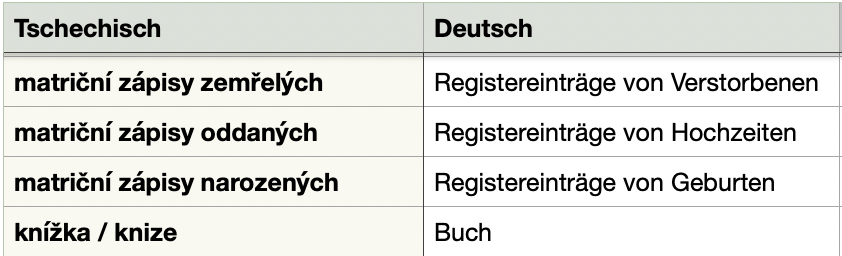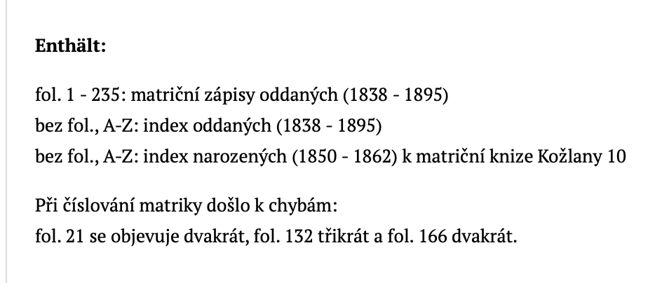 In der Ergebnistabelle in der Spalte „Datace“ finden sich Anfangs- und Endjahr des Buches, sowie die Kennzeichnung, welche Einträge enthalten sind: * für Geburten, *i für den Index der Geburten, ∞ für Trauungen, ∞i für den Trauungsindex und + für Sterbeeinträge sowi +i für den Sterbeindex. Über die Lupe gelangt man schließlich zum Buch, wo man die einzelnen Seiten aufrufen kann und nochmals allgemeine Hinweise erhält. (Zu diesen Hinweisen kommt man ebenfalls, wennman auf die Buchnummer zB Kozlany 05 klickt.