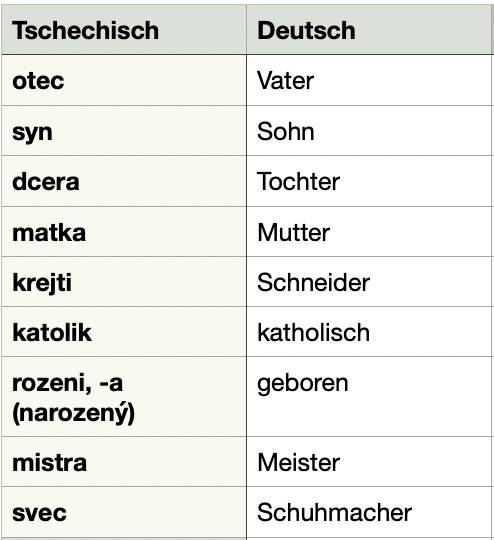 - Braut: Katharina Ludmilla Prunner, „Kirschnerstocher“ (Kürschnerstochter), eheliche Tochter des Joseph Prunner, Kirschnermeisters in Kozlan No. 125., selber ist am Leben in Kozlan, Rakonitzer Kreis in Böhmen und der verstorbenen Mutter Maria geborene Stanislaw Schneiderstochter aus Cestar (Cistar?), Rakonitzer Kreis in Böhmen
