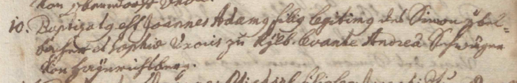 Baptisatus est Johannes Adamus filius legitimes des Simon Übelbacher et Sophia uxoris zu Kylb. Levante Andrea Schwager von Heinrichsberg
